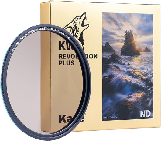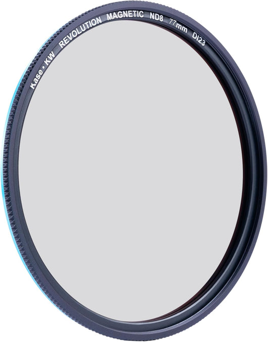 Kase's ultra-light, extremely thin Revolution magnetic filters feature the same shockproof, tempered, durable and easy to clean optical glass as the renowned Wolverine series with the addition of color coding on the outer rings for easy identification, stronger magnetism and a single filter thread to catch a traditional lens cap. This is an extremely durable, tempered optical glass 3-stop ND8 neutral density filter. Revolution filters have no color cast and the magnetic system allows photographers to quickly swap and stack up to 4 Revolution filters with ease. Each filter is extremely thin and light.